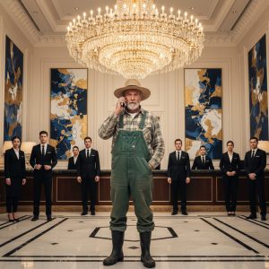 La jeune réceptionniste, au rouge à lèvres éclatant, le détailla des pieds à la tête en fronçant les sourcils. À ses yeux, un hôtel 5 étoiles n’accueillait que des gens élégants et « réussis », pas des paysans aux vêtements tachés. Elle se racla la gorge et lança d’un ton froid :